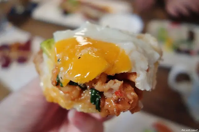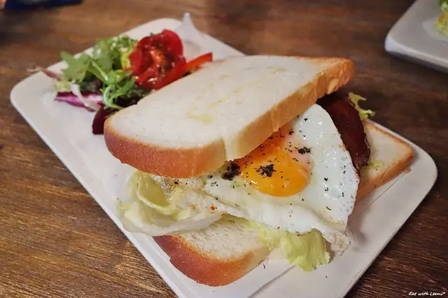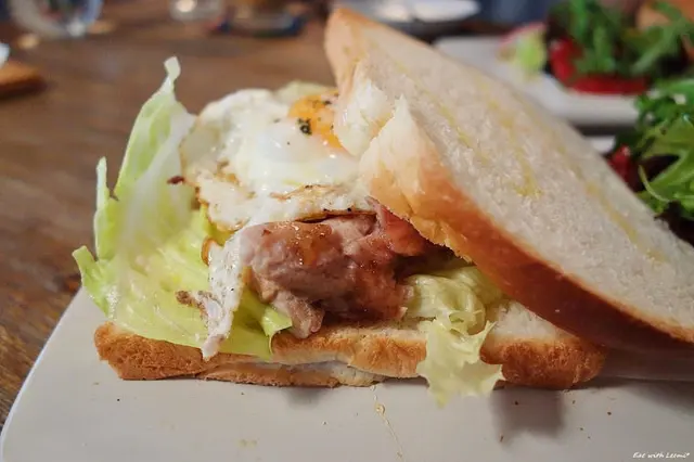 小里肌豬焦糖蘋果三明治的豬肉是採用低溫調理的作法,但口感吃起來不如預期中的柔軟,甚至有點偏乾,蘋果片的酸甜與口感讓整體風味較為清爽,不過菜名之中的焦糖香味和我預期的有點不同,此外這裡的三明治都不屬於特意強調豐厚的類型,這款的夾餡加上吐司一起吃後覺得味道較淡,幸好太陽蛋煎得很不錯,半熟蛋黃有彌補一點濃厚感,上頭的調味也頗加分。