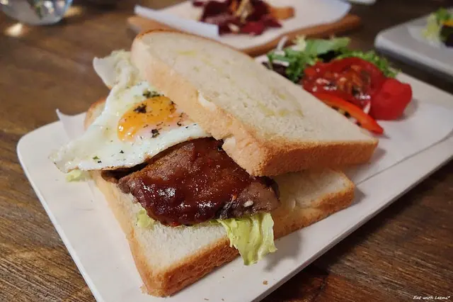 另外一款BBQ牛小排比較適合我自己的口味偏好,香料帶出不少風味來,牛小排同樣也是低溫調理,整體來說比豬肉好,但也有一點偏乾的問題,其他配料則同是太陽蛋和些許生菜,不過小里肌豬和牛小排這兩款三明治採用的吐司麵包部分非常可惜,沒烤酥加上色欠了點香味口感,不過內側的抹醬調味不錯。