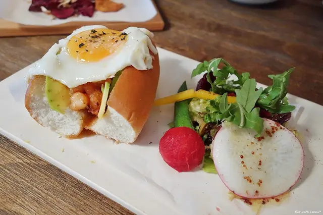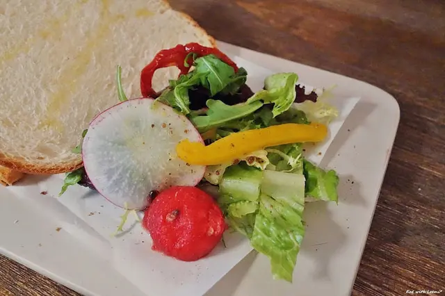 三明治都有附上配餐,這天吃到的沙拉雖然份量不多,但醬汁酸爽好吃,蔬果的內容組合也相當喜歡,不過擺盤方式有點微妙,墊紙被醬汁浸濕後其實不太美觀,覺得這種小細節有點追不上整間店所呈現出的美感。