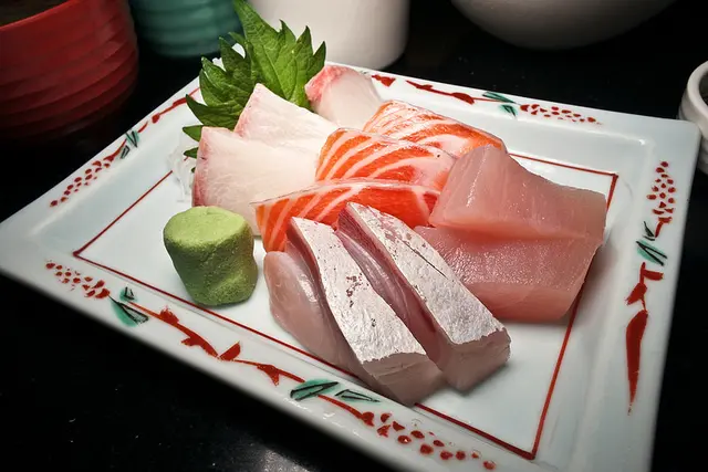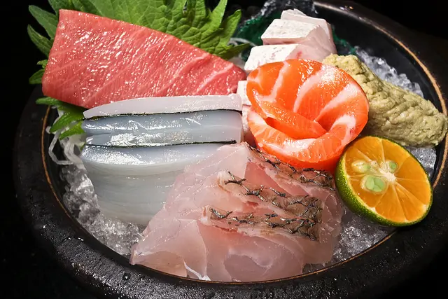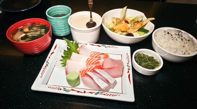 本日生魚片定食的生魚片是鮭魚、海鱺、紅魽、旗魚