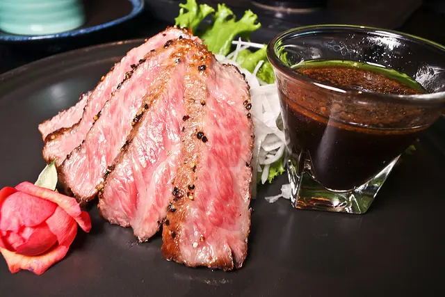 吃時可以直接吃享受和牛的油脂香氣, 若覺得稍油(台灣人其實蠻多人怕吃太油的東西) , 則可以搭配一下醬汁一起吃