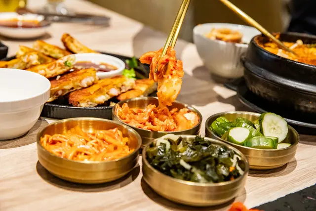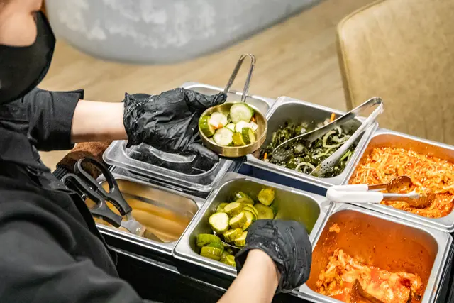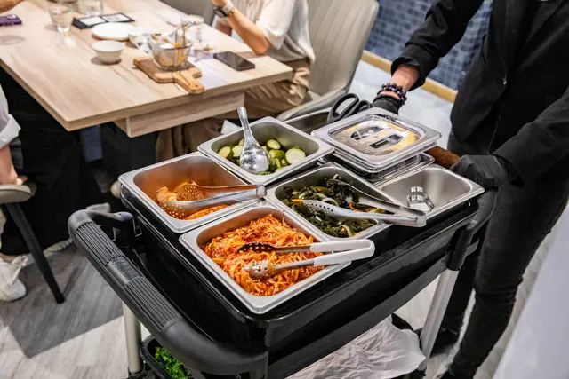 點好菜店員會先送上四品小菜,韓式小菜是無限吃到飽的,餐期間店員也會推著小菜餐車著著詢問有沒有要補小菜的,服務非常貼心,韓式小菜口味也非常不錯,吃到飽蠻佛心的