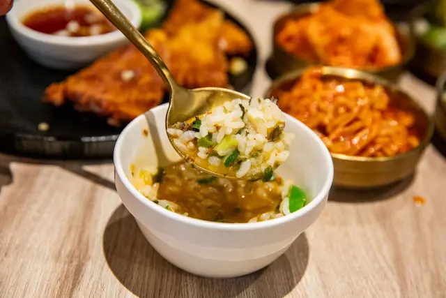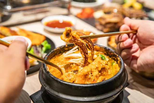 梨泰院海陸嫩豆腐鍋,出自韓劇梨泰院class最受歡迎料理之一的人氣冠軍梨泰院海陸嫩豆腐鍋,還有附白飯一碗,湯頭非常的香醇,微微的酸辣感非常開胃,裡面的配料也很豐富,鮮蝦、魷魚、肉片、嫩豆腐等等,可以像韓劇一樣把湯拌的白飯一起吃,十足就是白飯小偷啊!