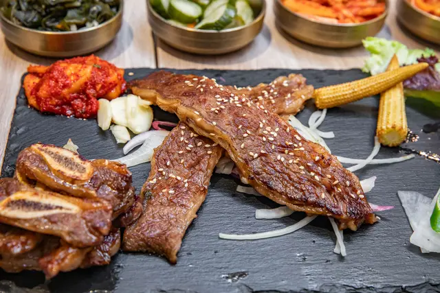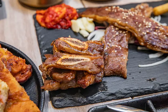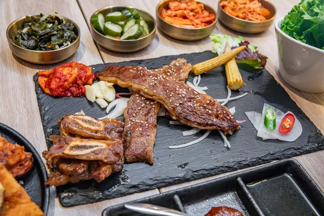 鐵板帶骨牛小排(鉄火烤肉、韓式生菜包肉+$60升級),來梨谷必點韓式烤肉系列,強烈加價升級榜上超熱銷的鐵板帶骨牛小排,是主廚在廚房用鐵板料理,再佐以配菜放在石板上呈現,擺盤相當精緻,還可以聞到鐵板牛小排的濃郁肉香