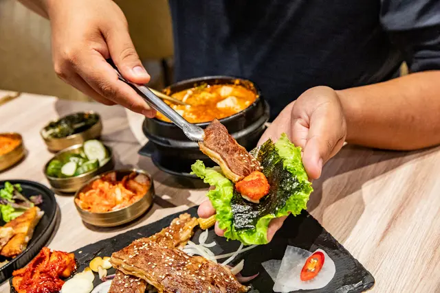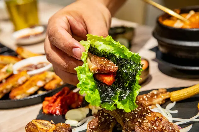 吃的時候可以用剪刀將牛小排剪成適口大小,拿起一片包肉生菜,依序放上喜歡的配料、泡菜、蒜片、海苔片等等,愛放什麼就放什麼,捲起來直接送入口中,爽脆的生菜包著各式配料跟鮮嫩的牛小排,口感非常有層次,味道也很清爽,不一會兒功夫我們就清盤啦!