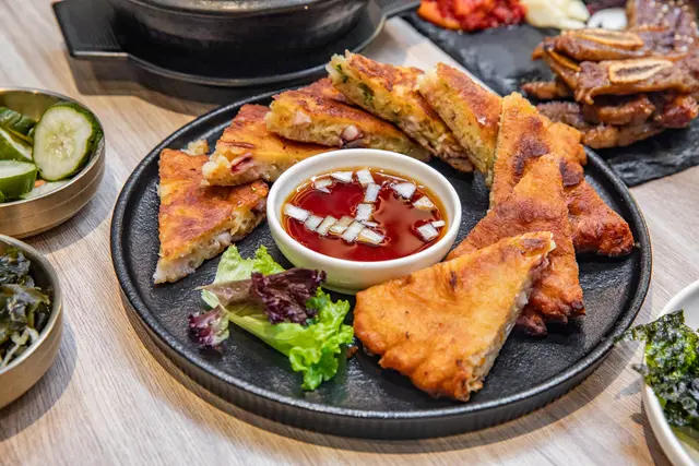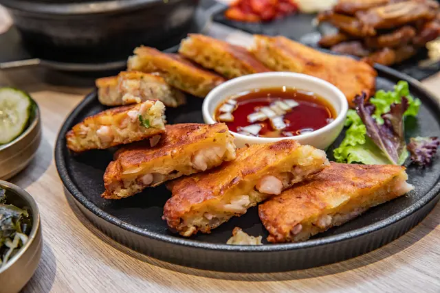 綜合海鮮煎餅,綜合海鮮煎餅超讚,這裡的海鮮煎餅是屬於厚煎餅,外酥內嫩,吃起來口感十足,裡面的餡料也很豐富,吃的到滿滿的海鮮鮮味,也有附沾醬,鹹甜鹹甜吃起來更開胃有層次感!