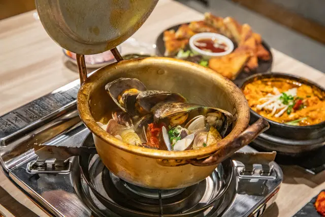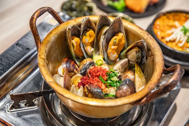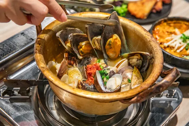燒酒蛤蠣兩吃(單點),必點!這個也是梨谷招牌菜之一,店員會先端上一個瓦斯爐,擺上裝了許多淡菜跟蛤蠣的小鐵鍋,接著豪邁的倒入一整瓶的韓國燒酒!然後蓋上蓋子烹煮