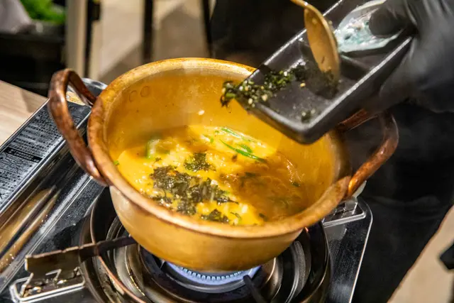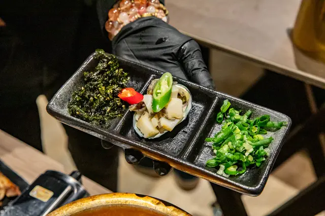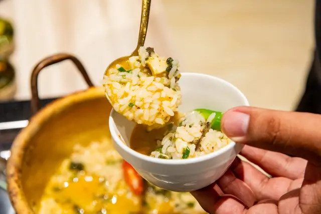 吃完淡菜、蛤蠣湯汁不要喝掉唷,這時就可以請店員來幫你料理第二吃:煮粥,店員會拿來煮粥的配料,配料竟然還有鮑魚!依序將白飯、配料依序下鍋煮,完全不用自己動手就有香噴噴的鮑魚海鮮粥
