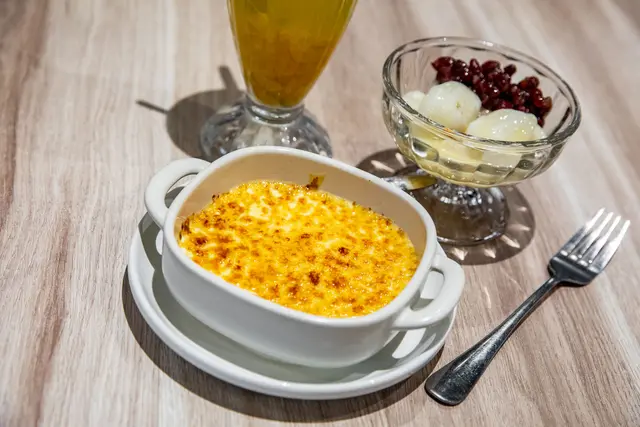 甜點是烈焰布蕾跟韓式烤年糕,烈焰布蕾表面有脆脆的焦糖,下面是帶有熱度蛋奶香的布蕾,柔滑濃醇,韓式烤年糕搭配蜜紅豆跟煉乳,外酥內嫩還有QQ的年糕彈性唷