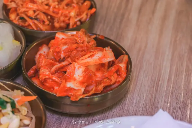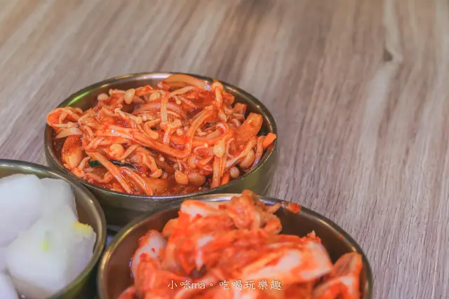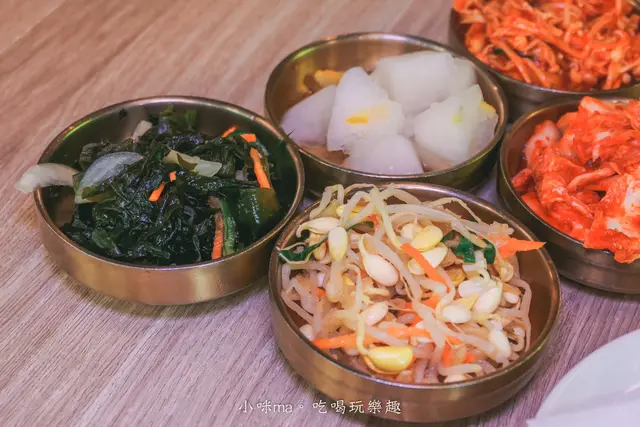 來吃韓式料理怎麼能錯過小菜哩,梨谷的小菜有五種,都是可以無限續加的喔,今天的是海帶、泡菜、柚香蘿蔔、豆芽、金針菇,真的每一種都好吃,連泡菜我也愛,不是假假的那種,光這一點就很加分,唯獨海帶稍鹹一點