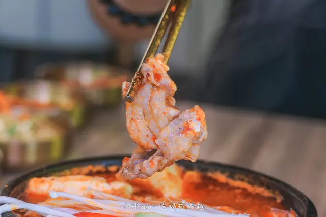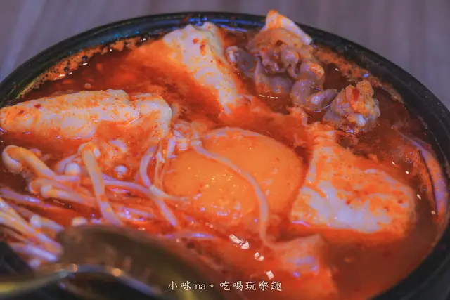 這裡面的料很多耶,除了嫩豆腐當底外還有年糕、蛋、肉片、泡菜、蝦子、蛤蜊、金針菇….,吃完是會飽的捏