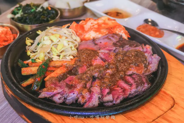 梨谷的特色還有這個-鐵板牛排,跟銅板烤肉又不太一樣,在廚房先幫你把肉烤到一定的熟度再上桌,一個SET分量還是很多,熱的鐵板放上韓式小菜,熱熱的吃又別有風味,建議一開始請服務人員不要淋醬,放在旁邊讓你自己沾著吃比較不會膩,我們第一次來還沒會意過來就請他淋上去,我覺得就會蓋住牛肉的風味