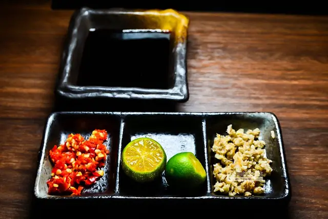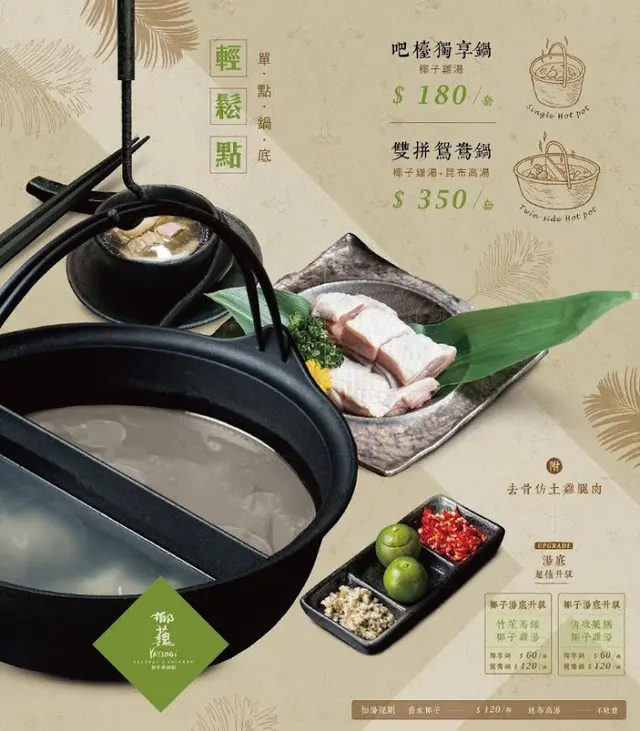 為了搭配椰子雞湯頭,所以店家也特地準備了三種特製的調味料分別是朝天椒、金桔與沙薑
