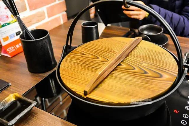 送上火鍋並打開電磁爐的開關與木質的鍋蓋,店員說:這裡的鍋要先把湯煮開才開始煮食材,跟一般把所有的食材都丟進去鍋裡跟著湯底一起煮開的方式不同