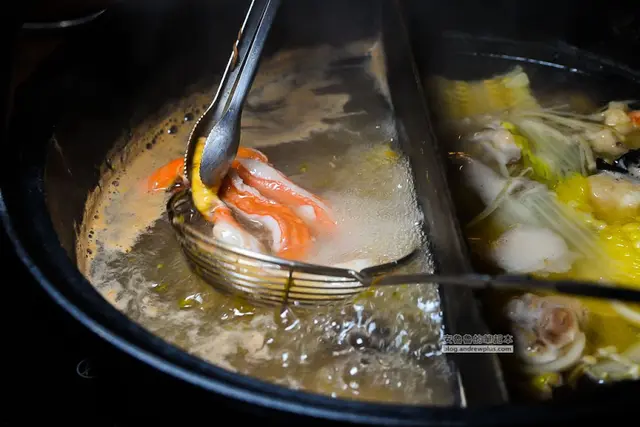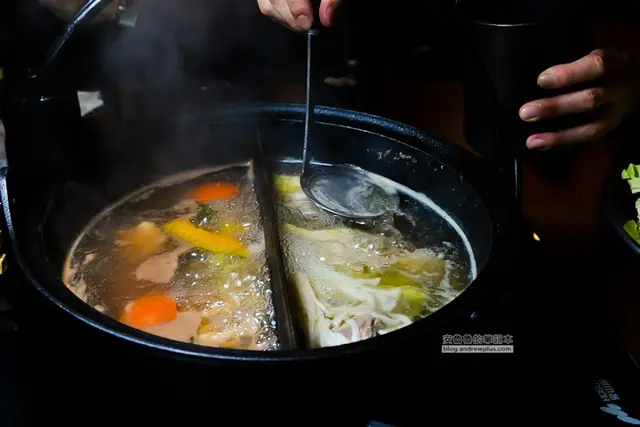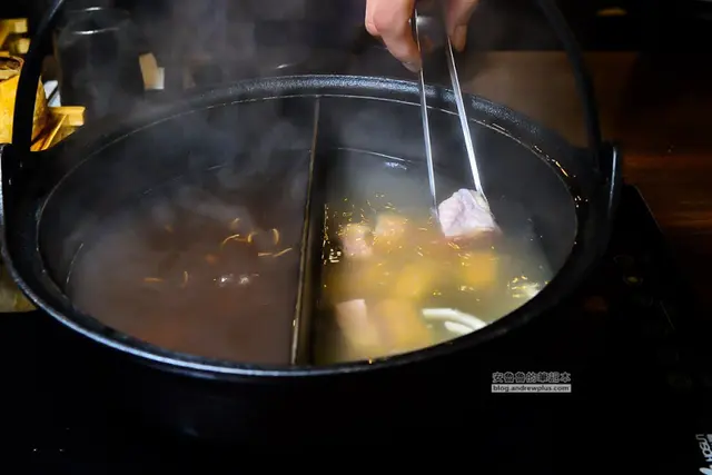 湯鍋裡面分成兩種湯頭,左邊的是昆布湯,右邊的則是店家的招牌-香水椰子雞湯頭。使用來自泰國香水椰子的原汁湯頭,裡面有新鮮椰子水與切成絲的椰肉,中藥裡椰子水偏涼性,但是椰肉卻是溫性,所以在椰子水裡面加入了椰肉一起煮整個湯頭就會轉偏中性,客人也可以要求多加點椰肉下去煮。