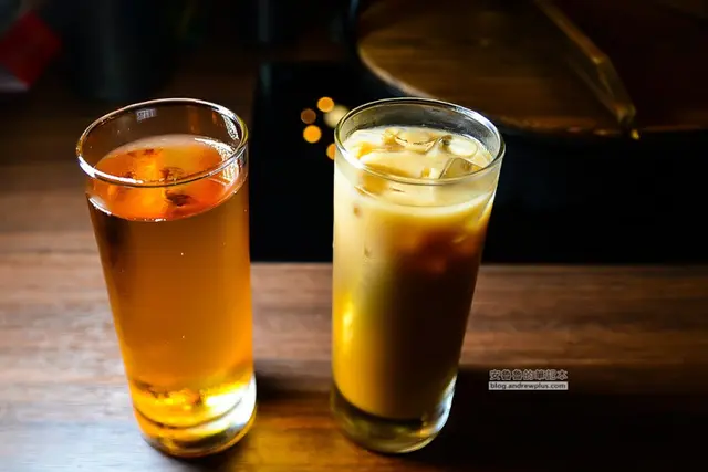 套餐裡面附了兩杯飲料,我們點了去冰的蘋果汁(左),以及特調奶茶(右),喝起來感覺就是真材實料