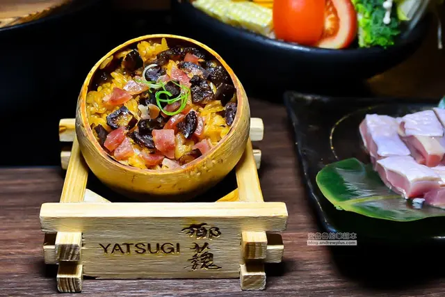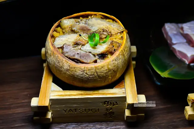 我們點了臘味和鹹豬肉各一;廚師很有創意的使用椰子殼做食器,盛裝泰國香米,再放上食材-臘腸與肝腸,另外一碗則是鋪上鹹豬肉,接著放進蒸籠蒸他個六分鐘,看起來很像是香港的煲仔飯,但作法上則有一點不同,看每位客人在餐廳裡面端著椰子殼吃飯,也挺有趣的!