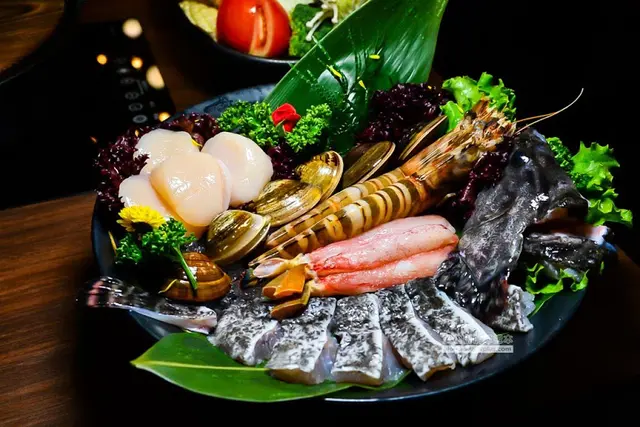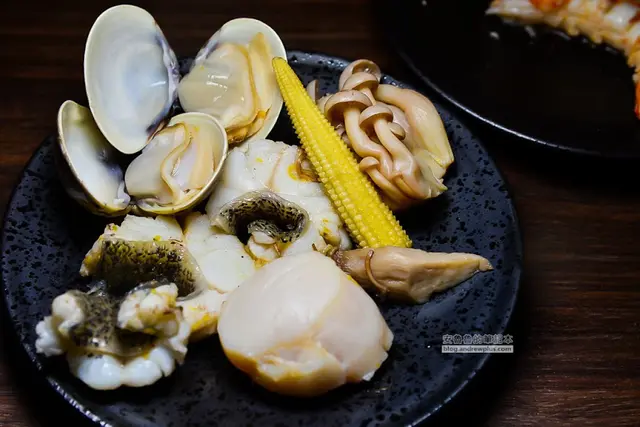 海鮮拼盤裡面的食材都是高級的食材,有北海道生食級干貝、肉質飽滿的大蛤仔、松葉蟹腳、明蝦與深海石斑魚,一上桌就覺得這一盤海鮮氣勢驚人