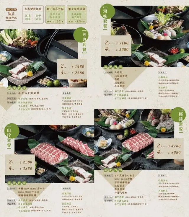 我們今天要吃的是雙人份的海鮮套餐,套餐裡面有 主食海鮮-包含大蛤仔、北海道干貝、明蝦、深海石斑、松葉蟹腳;特色主食-椰子蒸飯(臘味、鹹豬肉、香菇雞);配套餐點-時令蔬菜拼盤、手工海鮮滑(旗魚、鮮蝦、花枝、干貝);甜食飲品-特製甜點、清涼飲品。