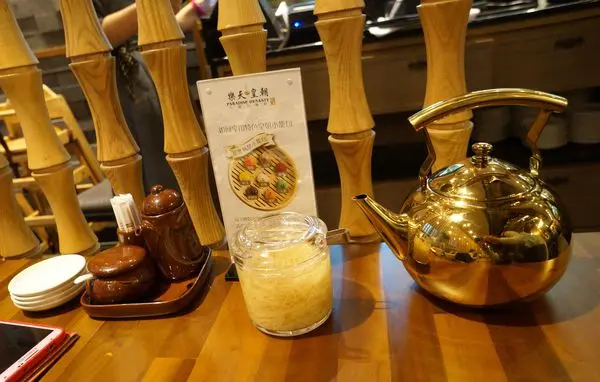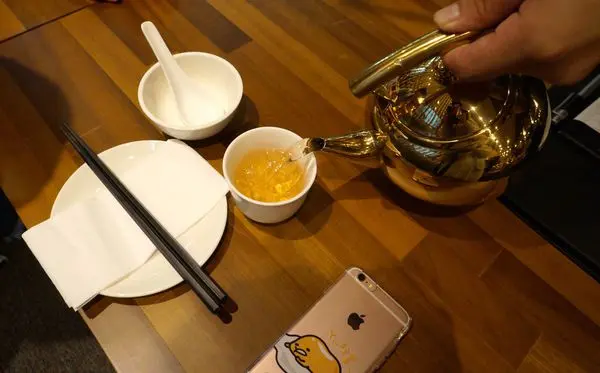 店家的茶壺很特別是金色壺子,蠻可愛的,第一杯人員會主動倒茶