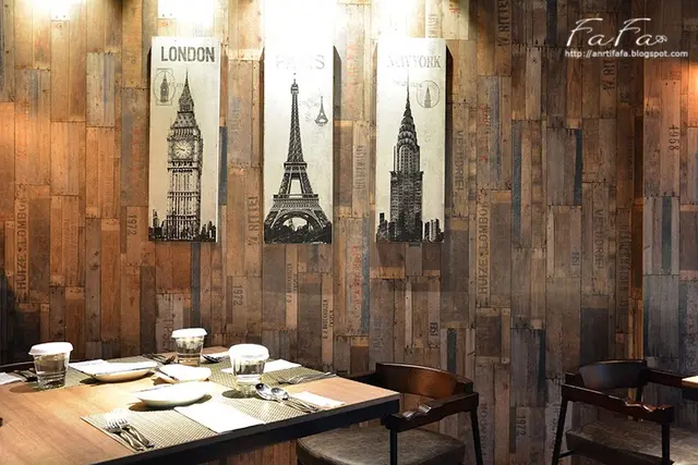 牆面是以直列方式拼接木板呈現,部分木板還印上字體,與以往常見拼法有截然不同成熟韻味,