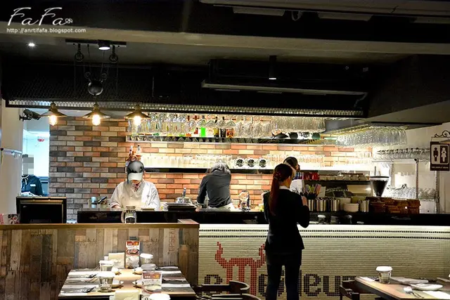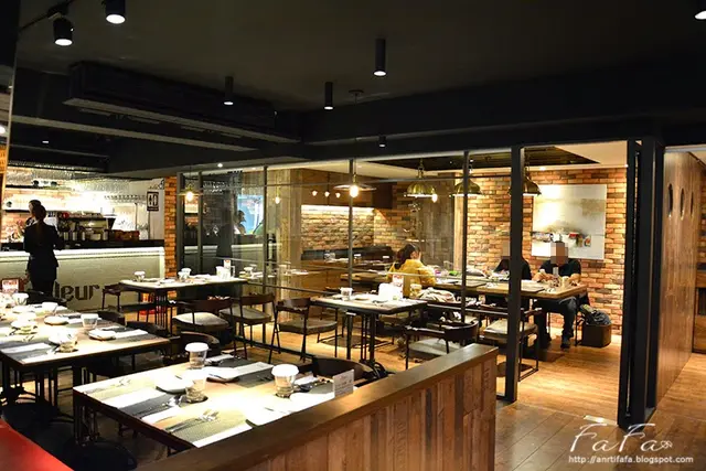 用餐空間因為入口處而分為兩邊,右邊以整齊的菱型方式擺放桌椅,前方櫥窗則是烹調料裡的廚房。