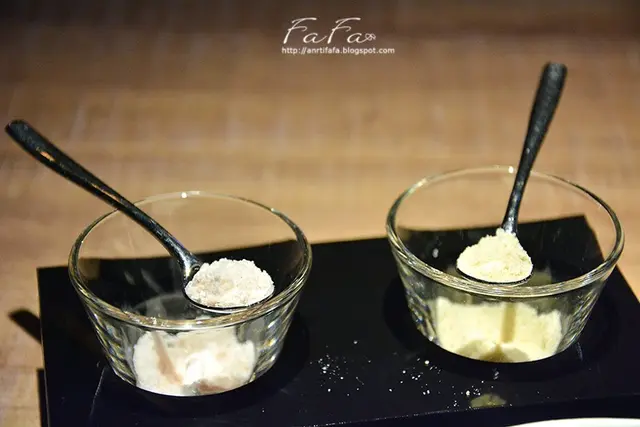 松露波特紅酒醬,味重濃厚帶一點點甜味,這讓我想起炭烤類的洋芋片。四種調味料分別是玫瑰鹽、柚子鹽、黑胡椒牛排醬、芥末籽