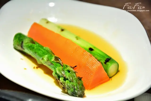 使用焦糖汁燉煮的胡蘿蔔及蘆筍有著淡淡甜味,胡蘿蔔口感還保有韌硬感氣味也較重,蘆筍部分脆口多汁。