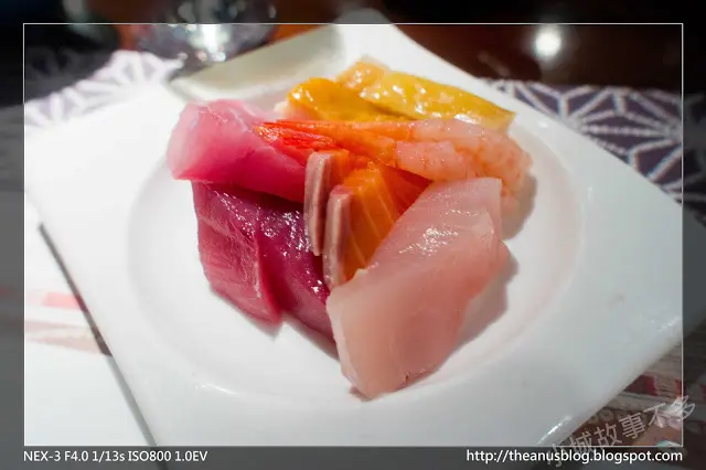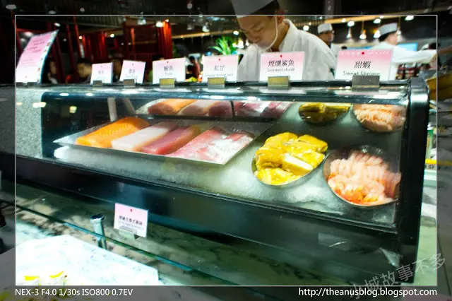 第一站當然是趕緊來生魚片吧檯前排隊啦~總共有六七種東西可以選,假如沒有特別厭惡某種魚類的話,可以請廚師幫你做一份綜合的,而魚片的新鮮度夠,肉質吃起來也算有嚼勁,不會軟軟的,算是有在均標之上的生魚片,不過我每次都會忘記我自己討厭吃鯊魚煙,為了不浪費食物,我在此覆蓋一張魔法卡,燃燒生命把他吃完T_T