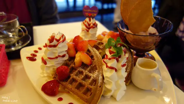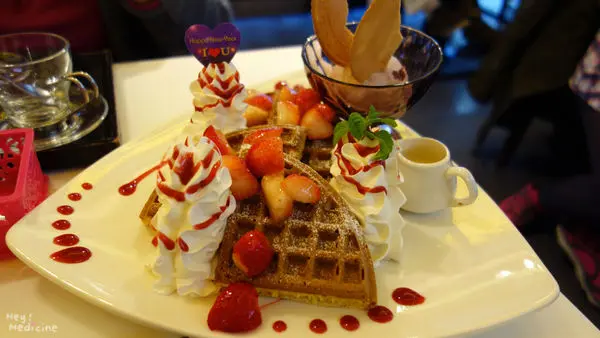 這裡的鬆餅主打「不加一滴水」,所以口感很厚實、也很香脆。旁邊的配料有草莓塊、鮮奶油、草莓醬、煉乳可以搭配,不過我覺得鮮奶油放太多了,讓人看了有一點沒食慾......