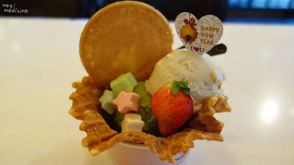 之前IOU的雙球組是可以自己選配料的,不過現在都只能由店員幫你配。我們今天配到的料有棉花糖、半顆草莓、一片法蘭酥。