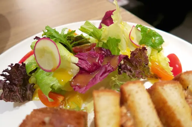 旁邊的沙拉淋上果醋的沙拉醬,很清爽好吃!