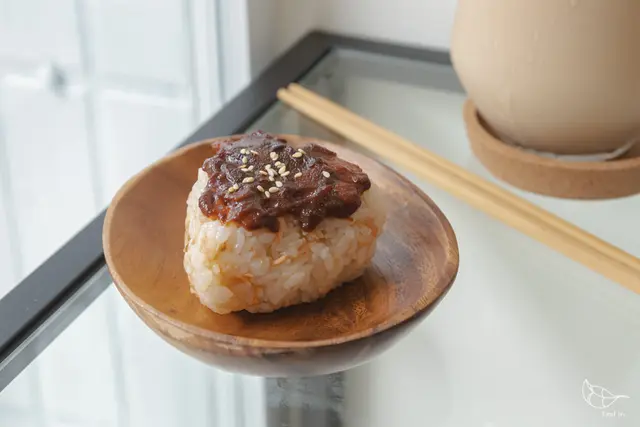 或許是因為餐點定位為日式飯糰的關係,所以當天僅提供的兩種口味,光是看名字都能感受到相當和式的風格。雞肉親子本丸上頭舖上的雞肉和半熟蛋,概念大抵是來自日本家常料理的親子丼飯,視覺上就相當可愛。