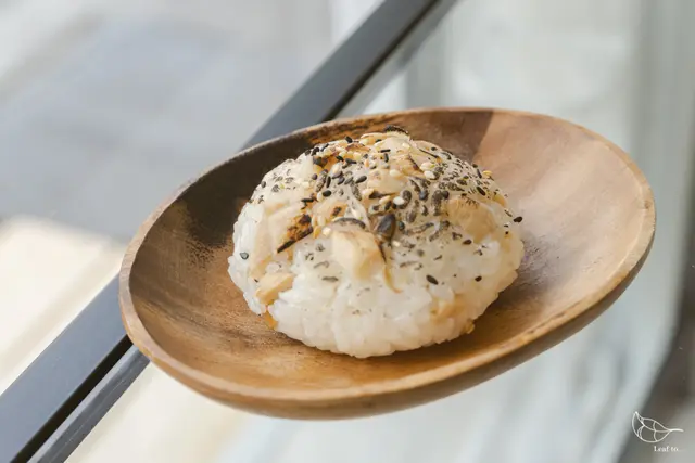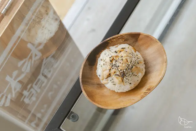飯糰的力道拿捏仍然相當恰到好處,這回選擇的杏鮑菇,簡單的鹽烤讓口感更加多汁且香氣厚實,尤其是表面還再火烤過,讓表面的焦香更明確,同樣是簡單的組合調味,吃起來令人感到滿足。