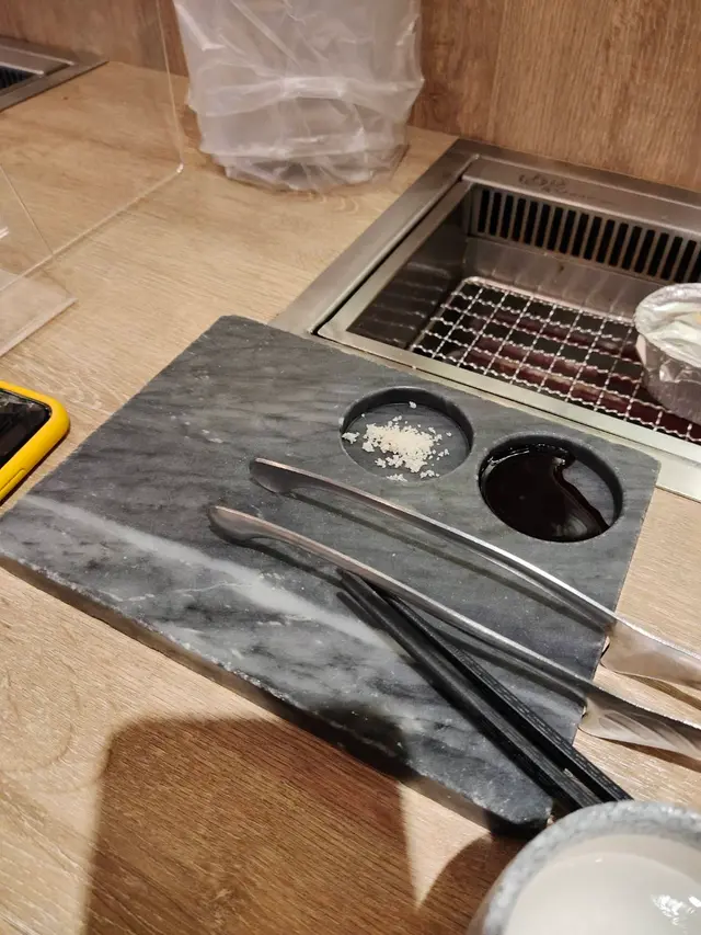 很特別的盤子,基本上就是把烤好的肉放上來,沾將放在凹槽內,說真的這個設計真的不太好用。