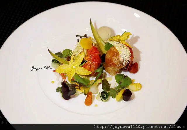 黃綠櫛瓜 甜椒 小黃瓜花 曇花蕊 甜菜根 櫻桃蕃茄 等特蔬食材 並點綴陳年白酒醋
