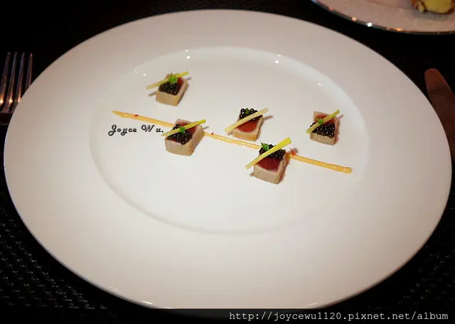 特別取用黑鮪魚腹肉下去做炙烤烹調煎封鮪魚四周 上方搭配魚子醬及玉米苗