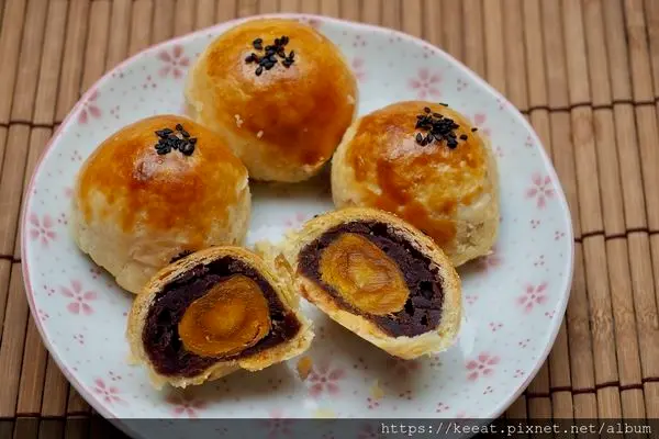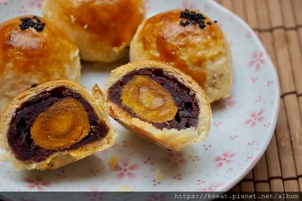 法朋烘焙甜點坊的法朋特製蛋黃酥是八顆裝,選用來自屏東鹹蛋黃與生態栽培紅豆、嘉義海鹽,以及歐洲天然奶油、日本熊本麵粉,集合了歐日台三地而成的蛋黃酥。