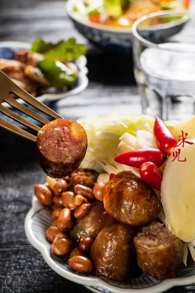 泰式酸香腸是自家醃製的獨特口味,鹹酸惹味,吃的時候配上生高麗菜、嫩薑片與炸花生,滋味更是豐富。