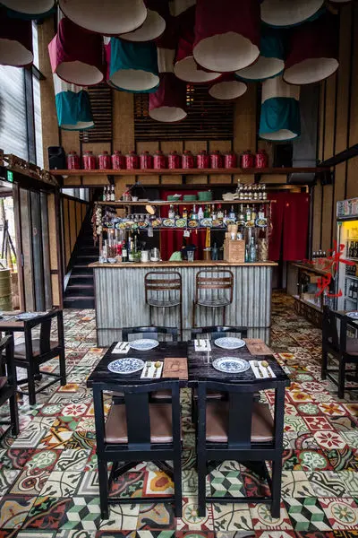 葉裕清以大量原木及自然元素打造出二層樓的挑高建築,最大的亮點就是從泰國找來的特色拼花地磚以及天花板上懸掛的許多布質吊燈,質樸的牆面及桌椅,因為有了這些色彩豐富的元素而活潑了起來,再加上精心設計的吧台及帶點陳舊感的吧椅,點出小酒館的風情。