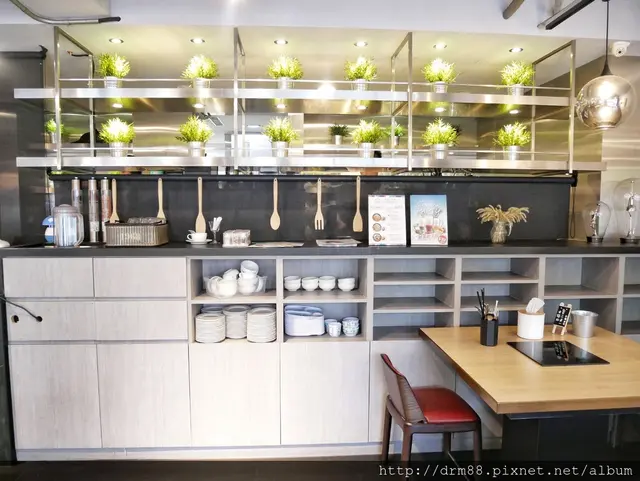 這面花草牆的後面是廚房,這裡有水以及調味料,碗盤可以自己取用,