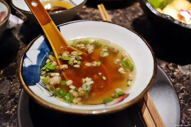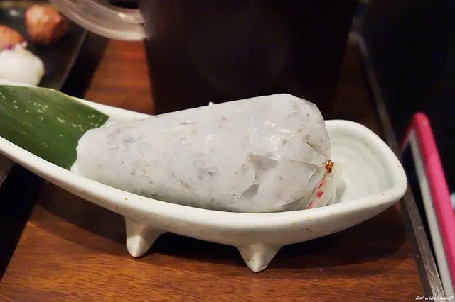 蝦滑口感不錯,擠成小小段的煮好吃來澎軟且滑口,本身蝦味倒是不太突出,外場有另外送來蝦滑用的佐醬,帶著一點酸味,很有提味效果。