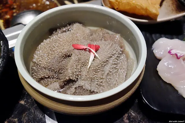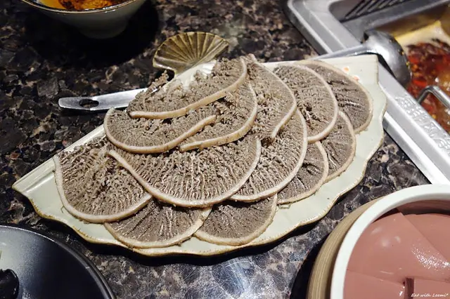 海底撈的毛肚分兩種,基本款撈派毛肚和我們平常在麻辣火鍋店吃到差不多,另一款是切法不同,外觀比較特別的千層毛肚,兩款都是涮個幾下就可以食用,煮過頭老掉的毛肚口感可是硬又韌口,我們都比較喜歡千層毛肚,口感較脆,而且是其他麻辣鍋店比較不容易吃到的作法。其實第一次來海底撈可以考慮多從菜單上的特色菜下手,除了毛肚之外,其他像吃麻辣鍋很合適的黃喉、鴨腸等也都在這個分類裡。