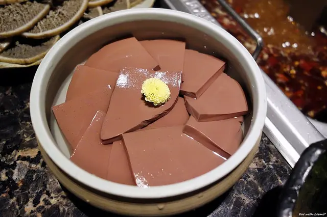 和其他菜色對比起來,這兒的血旺倒是顯得不算貴。相貌就像是切得較薄的鴨血片,孔洞不多,用麻辣湯煮過好入口又夠味,小碟的辣粉服務人員說是配血旺吃的,不過湯頭煮過本身的味道已夠,這粉是用不太到。