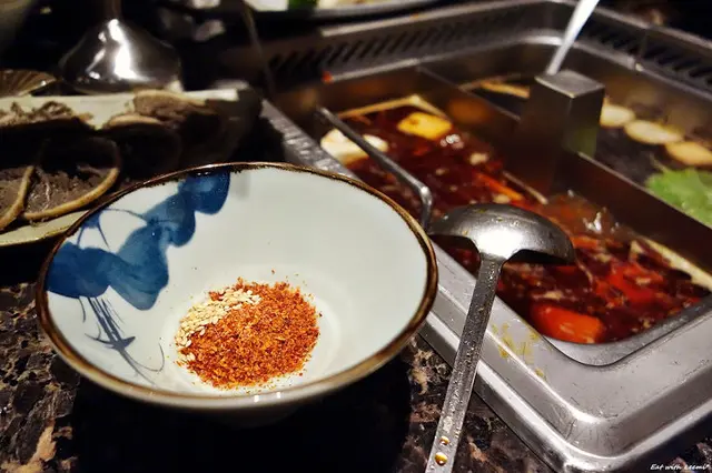這天選了麻辣+菌湯的拚鍋,海底撈的麻辣鍋是清油火鍋,用的是植物油,口味比較不像用牛油炒料的麻辣鍋那般濃郁強烈,湯頭上浮的油量也不算很厚,當天同行的朋友們都偏好重口味,點餐時店員便有建議麻辣鍋底可以先試試基本的辣度,若真不菌湯夠味可以再追加,果然等鍋上桌一試辣度麻度都稍欠點, 後頭加料調整過後風味便比較足夠了,對比之下菌湯鍋底則像是清淡版本的香菇雞湯很好入口,只是煮到後半場鹹度提升不少,另外服務人員幫我們從醬料區調了每人一碗的佐料,是要淋上菌湯一起喝的,大概是肉末的效果讓轉換了未到,喝來也有加分,海底撈的菜單上有寫明鍋底是人工調製的,能事先知曉倒也比較容易接受,海底撈也有販售火鍋底料包除了門市以外現在不少通路也可以買到,要在家重現這一味變得簡單許多。