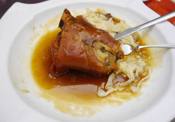 滷的上色的豬腳佐以少許帶鹹味的高麗菜乾