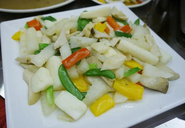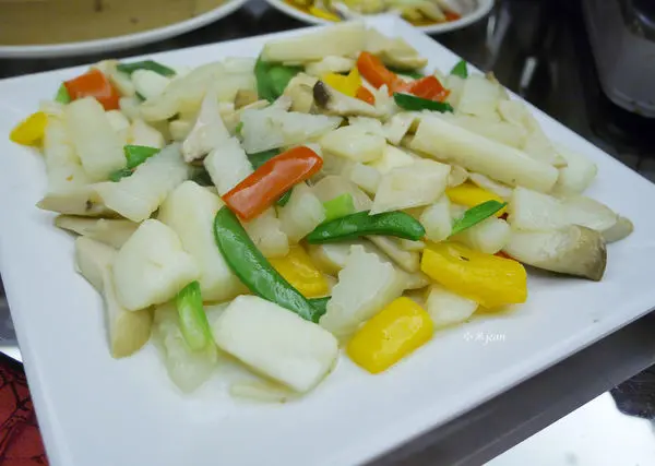 以簡單的勾芡加入山藥 荸薺 豌豆 黃椒 紅椒 蔥花等整體配色豐富