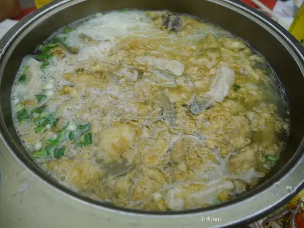 湯頭裡有炸魚塊、切塊芋頭、火鍋料(燕餃)、米粉、芹菜末、蔥花