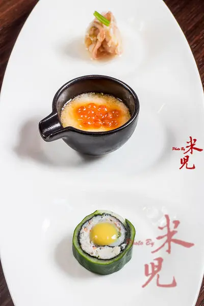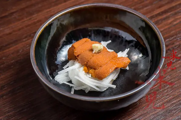 前菜之一的海膽山藥絲,光看海膽上面的顆粒分明就知道鮮度百分百。