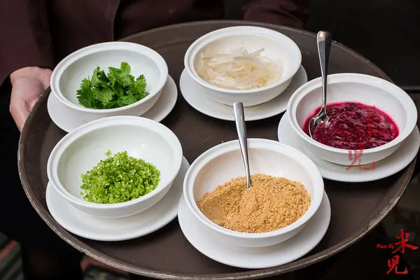 這是西式吃法搭配的配料,有香菜、芹菜末、銀芽、花生粉和蔓越莓醬~~